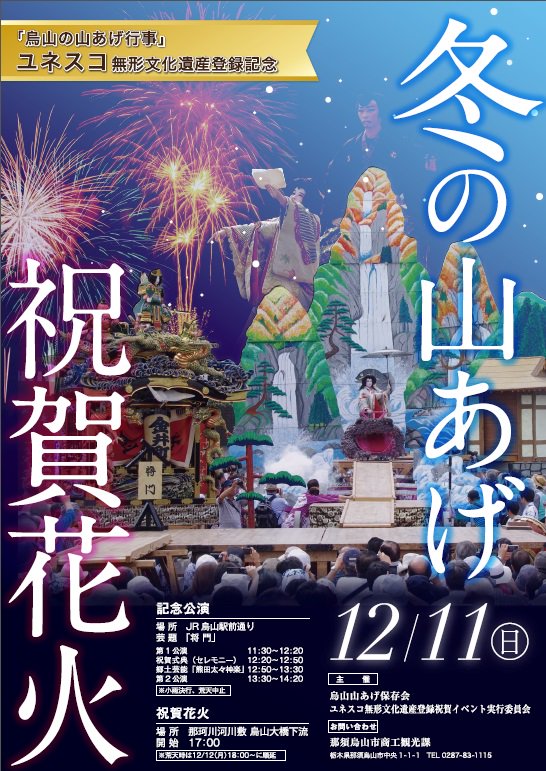 那須烏山市 Na Twitterze 烏山の山あげ行事 ユネスコ無形文化遺産登録記念 冬の山あげ 開催 記念公演 将門 のほか 祝賀花火の打ち上げも行いますので ぜひ足を運んでみてはいかがでしょうか 日にち 12月11日 日 詳しくはこちら Https T Co